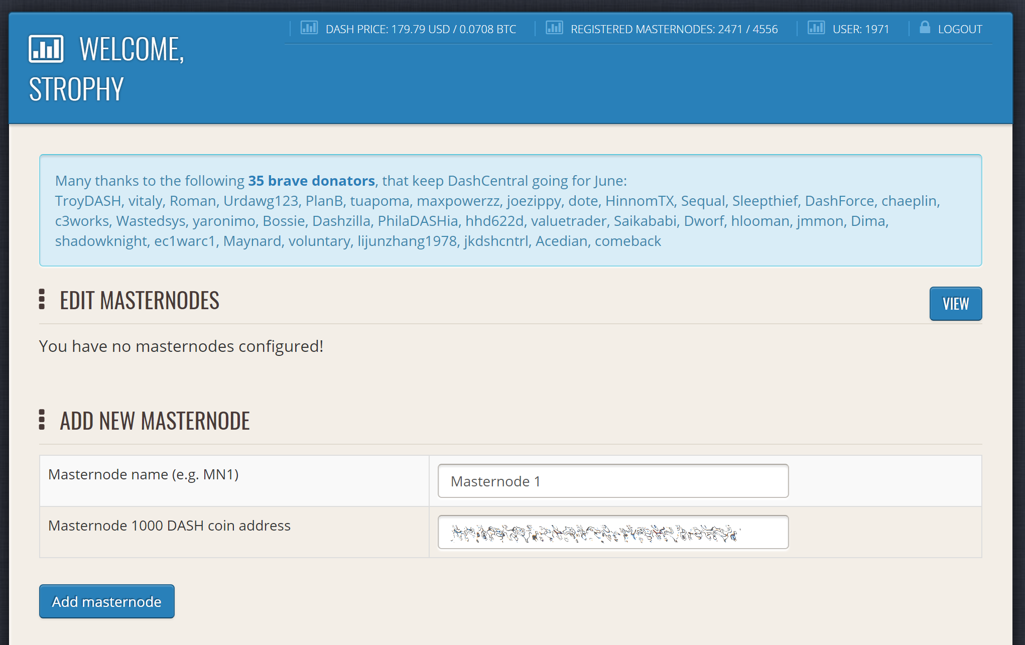 Click Add masternode. Your masternode has now been added to DashCentral.