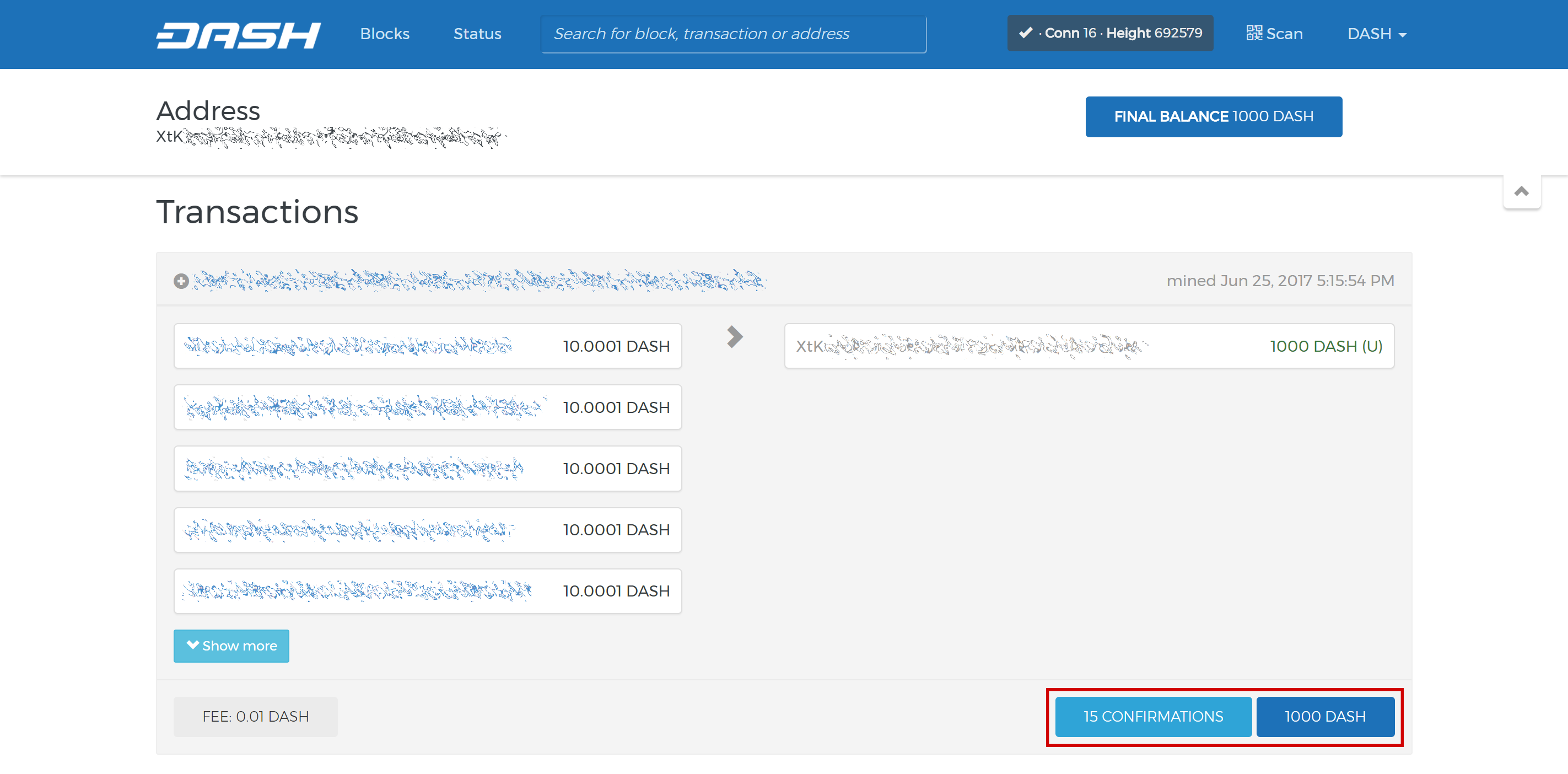 Now send exactly 1000 DASH in a single transaction to the new address you generated in the previous step. This may be sent from another wallet, or from funds already held in your current wallet. Once the transaction is complete, view the transaction in a blockchain explorer by searching for the address. You will need 15 confirmations before you can register the masternode, but you can continue with the next step at this point already: generating your masternode operator key.