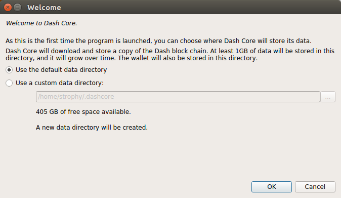 The first time the program is launched, you will be offered a choice of where you want to store your blockchain and wallet data. Choose a location with enough free space, as the blockchain can reach 45GB+ in size. It is recommended to use the default data folder if possible.