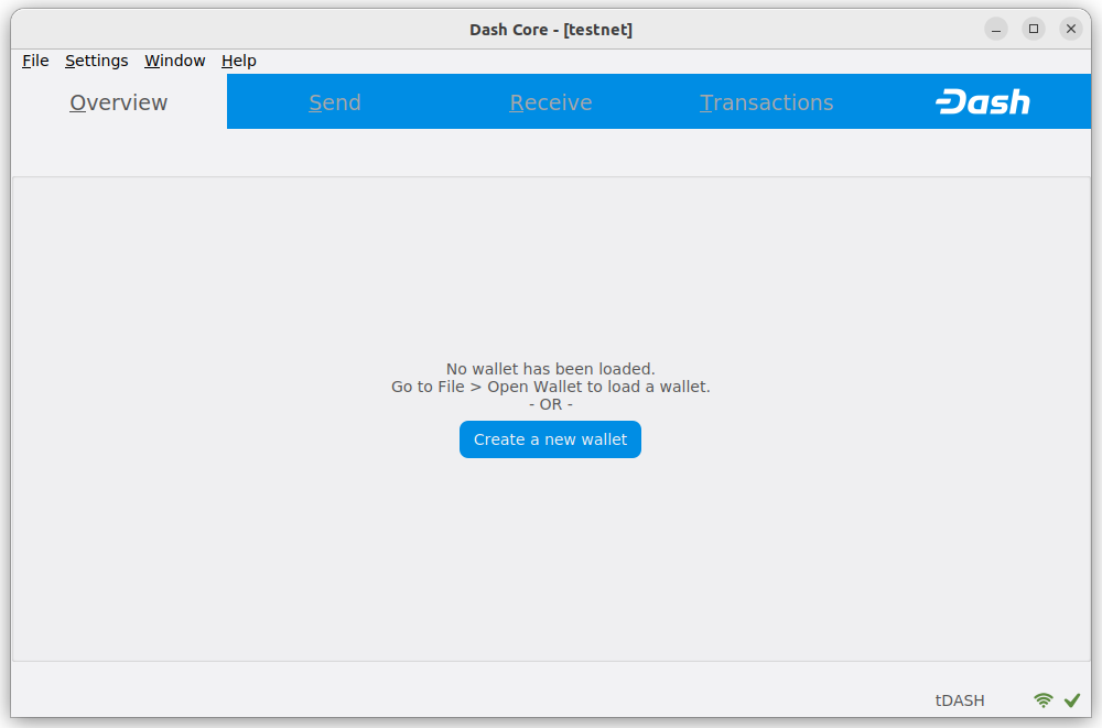 If no wallet files are loaded, you will get this prompt in the Overview tab. To create a wallet, click the Create a new wallet button or click File -> Create Wallet. HD wallets are created by default. See the advanced topics section for information about HD wallets.