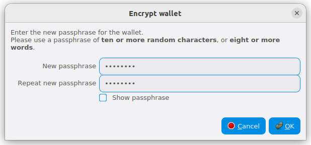 You will be prompted to create a new wallet with a custom wallet name. By default, your wallet will be encrypted. You may choose to uncheck the box and encrypt the wallet later. We have included instructions on how to encrypt your wallet in the following section.