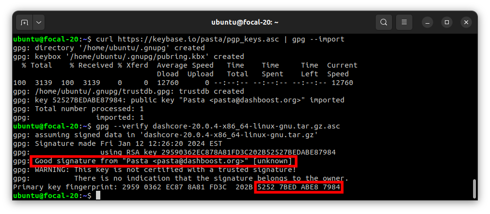 If you see the message Good signature from ... then you have an authentic copy of Dash Core for Linux.