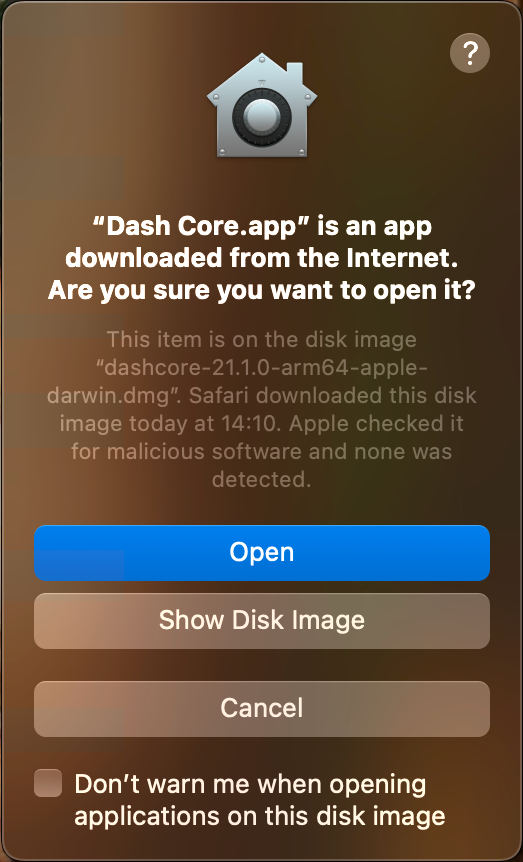 To run Dash Core for the first time, either open Launchpad or browse to your Applications folder in Finder. Double-click Dash Core or Dash-Qt to start the application. You may see a warning about opening an app downloaded from the internet. Simply click Open to continue launching the application.