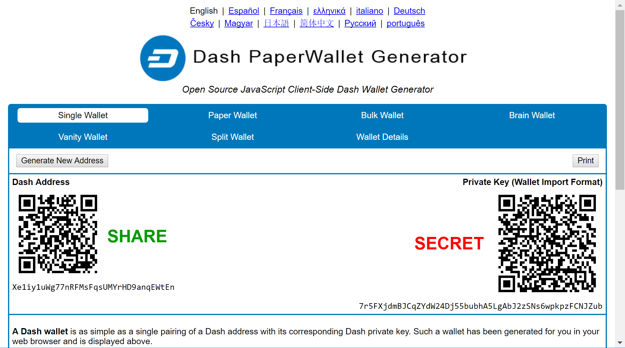 Once your public address and private key (shown in Wallet Import Format or WIF) are visible on the Single Wallet tab, you should immediately click Print to print the data and store it securely. If you leave the page without somehow recording the dash address and private key, all data will be irretrievably lost, together with any funds you have sent to the address.