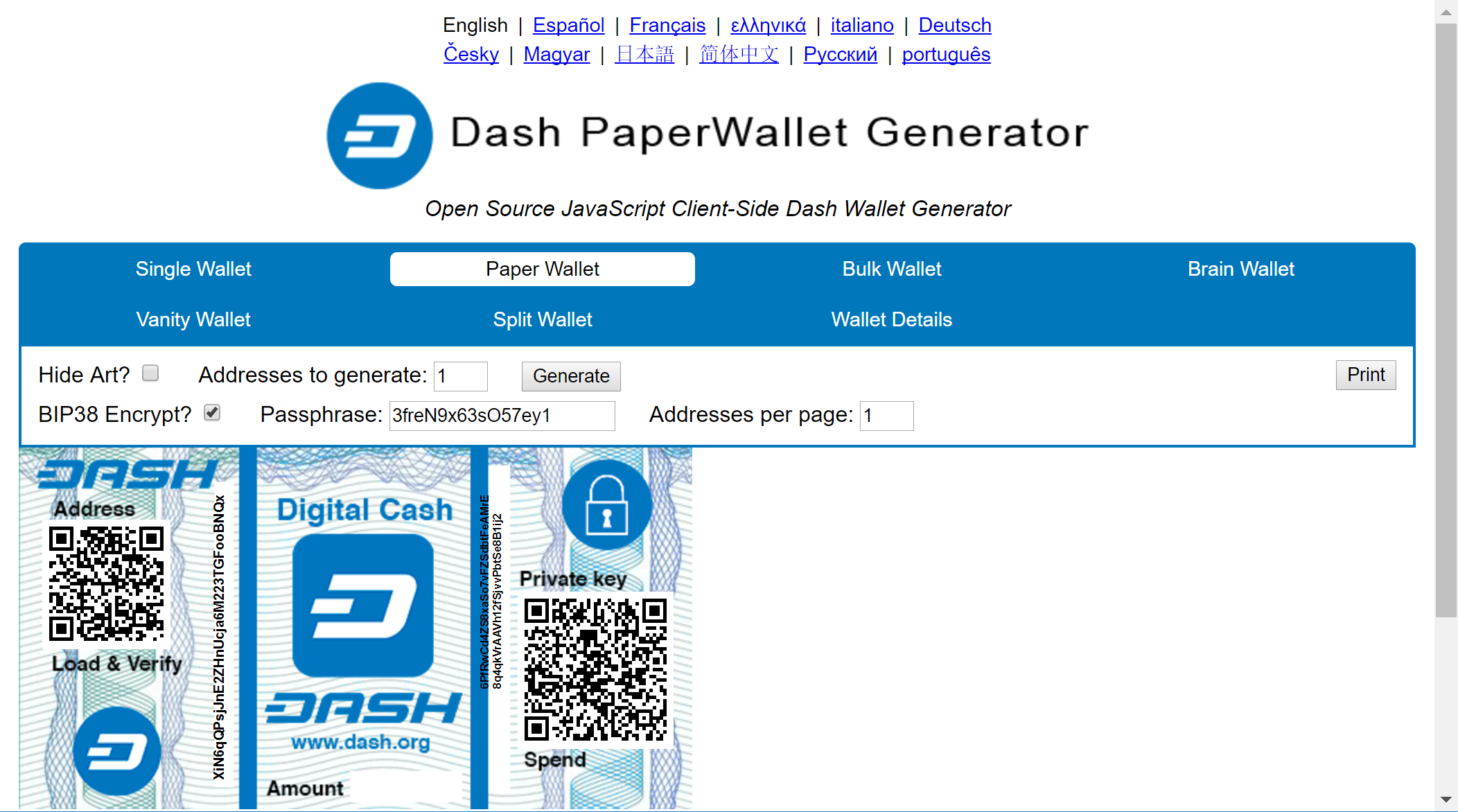 Go to https://paper.dash.org in your web browser (or open index.html if you downloaded the wallet generator). Select your language and choose Dash as the currency if necessary. The following screen will appear: