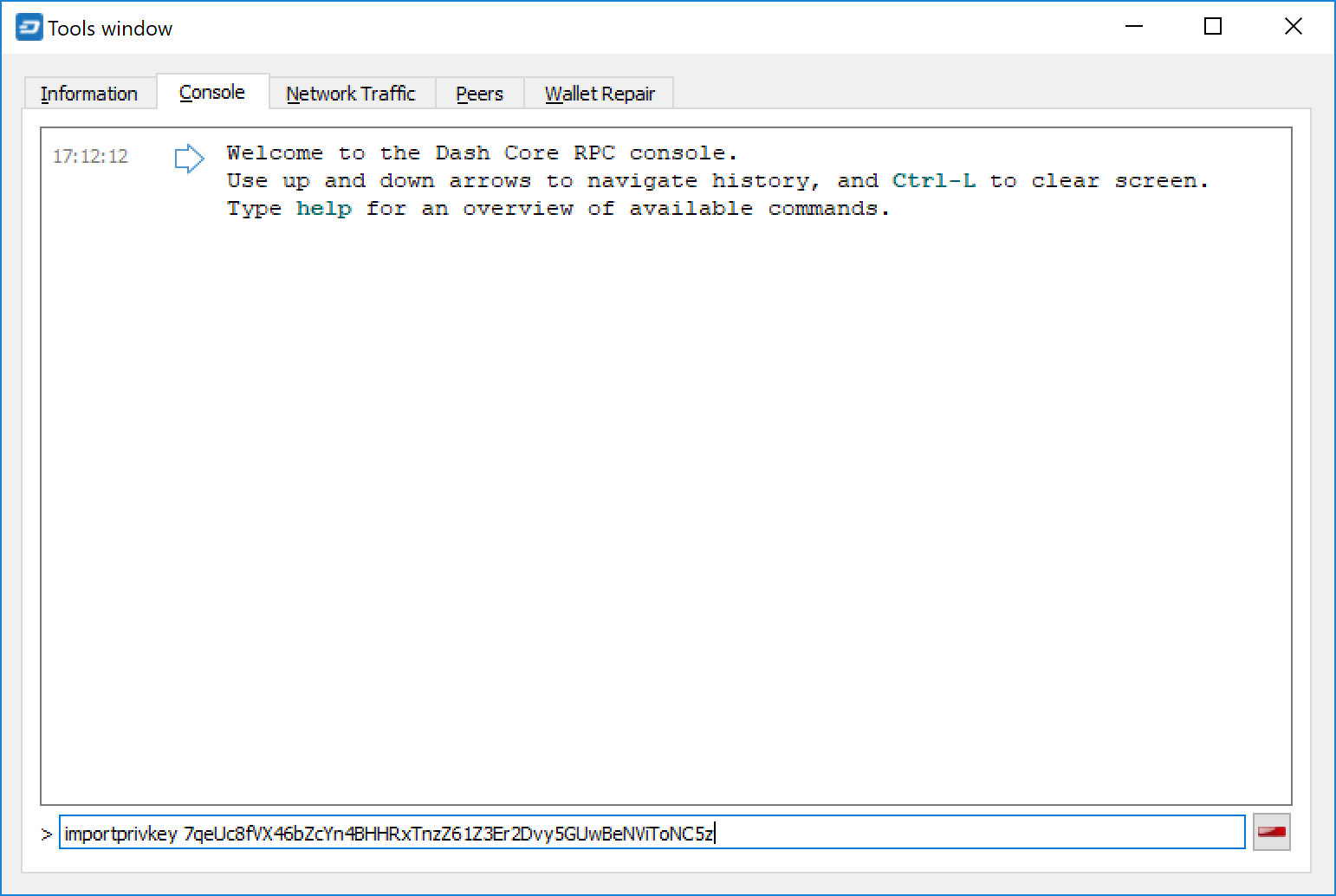 When you are ready to spend the balance on the paper wallet, you will need to import the private key used to control the address printed on the wallet into another Dash wallet that is connected to the internet. We will use the Dash Core Wallet in this example, although Dash Electrum and mobile wallets are also supported. Open Dash Core Wallet, click Settings and Unlock Wallet. Enter your wallet passphrase. Then click Tools > Console. The console appears. Enter the following command:
