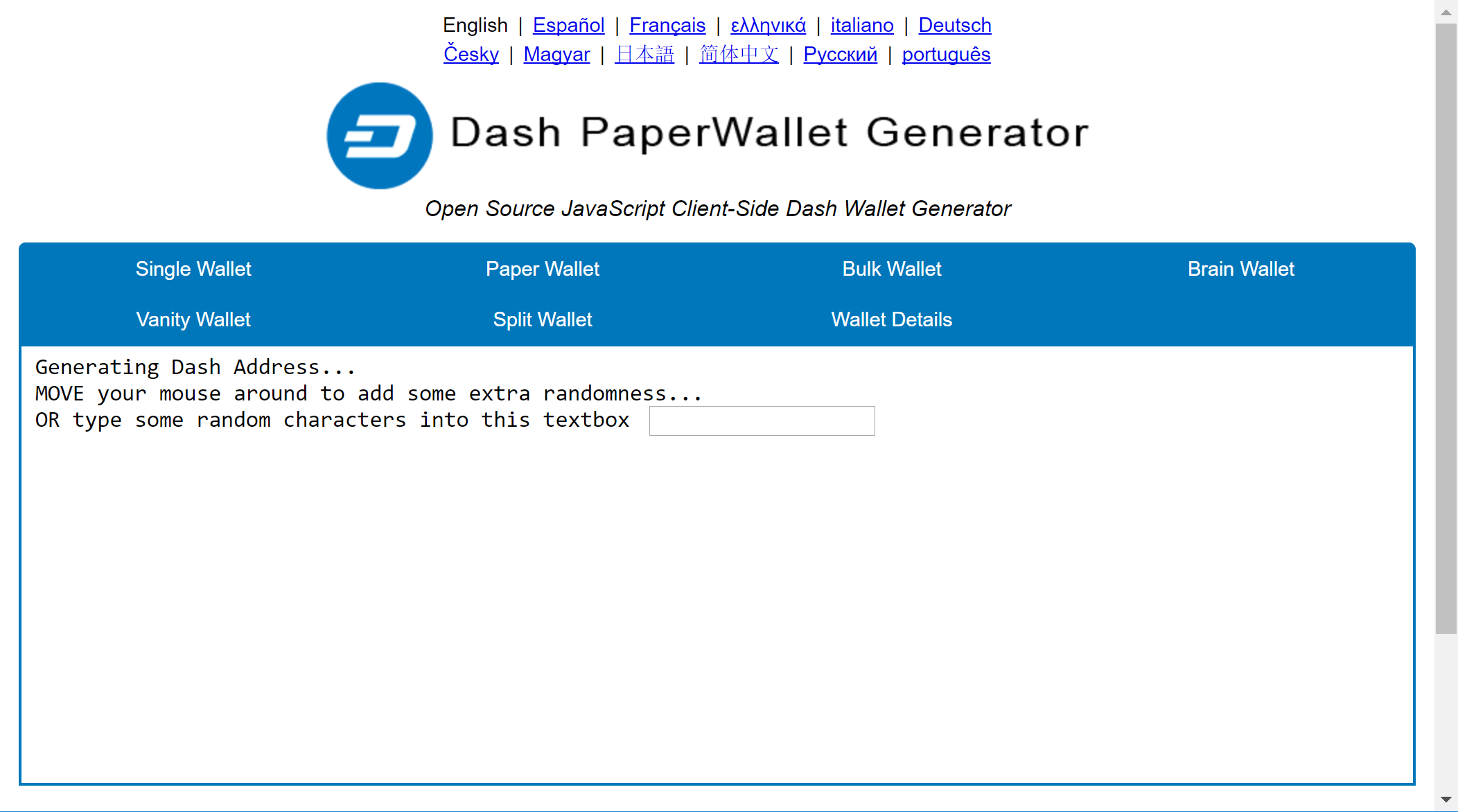 Since the source code for all three options is largely similar, this guide will use https://paper.dash.org as an example. The websites listed here run entirely in your web browser without sending any of the data generated to an external server, but the most secure option is to download the wallet generator and run it on a computer with a freshly installed operating system that is not connected to the internet.