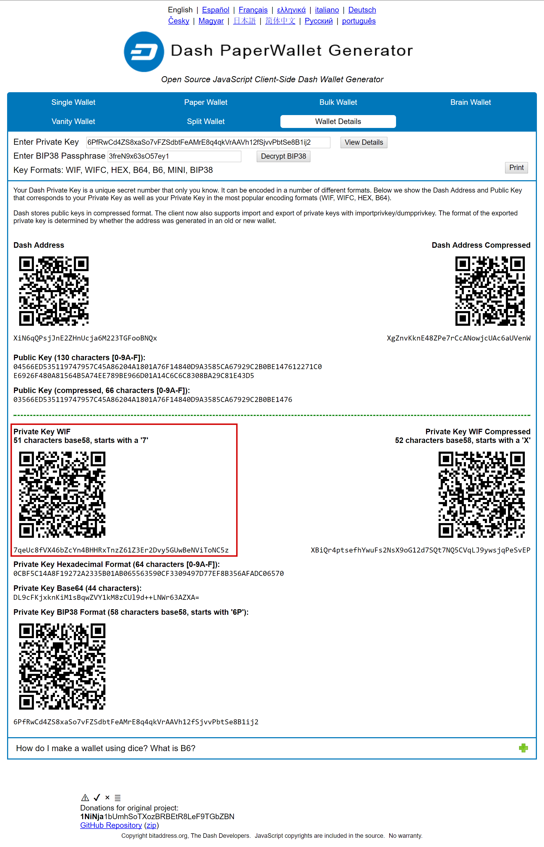 Dash Paper Wallet Generator displaying information derived from an encrypted private key#